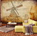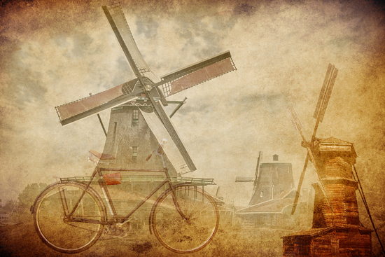 Фотообои с изображением сельского пейзажа с велосипедом и мельницей, приятное дополнение к оформлению вашей комнаты.