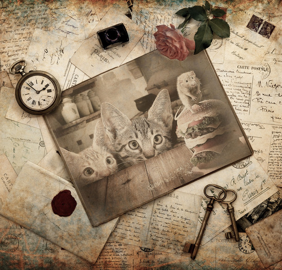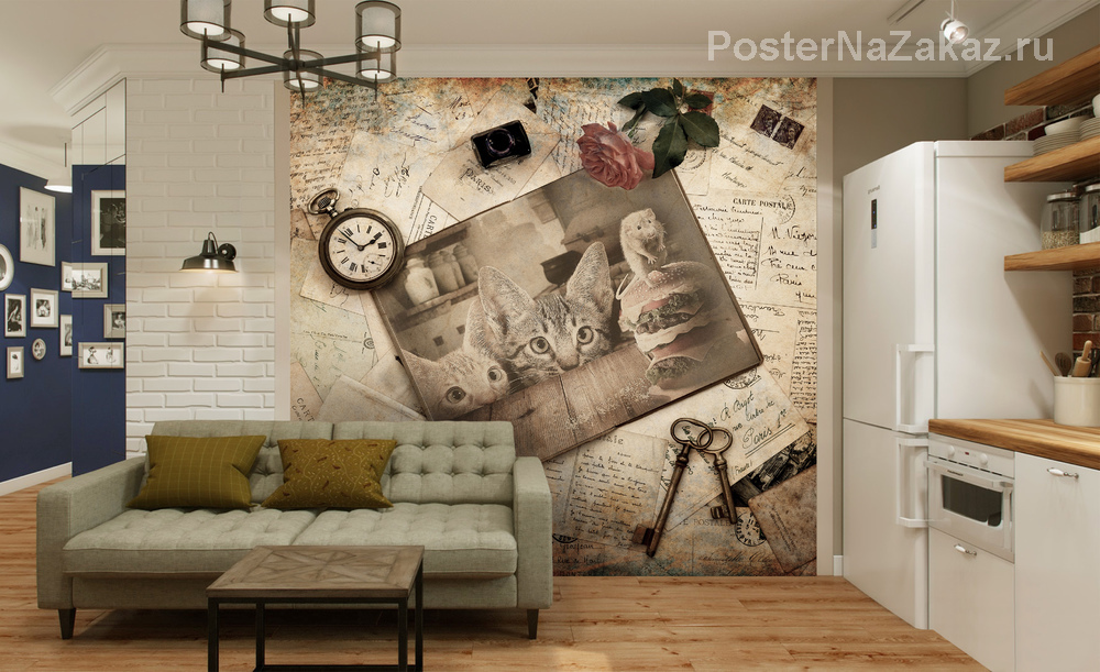 Изображение в интерьере коллажа с письмами, розой, карманными часами и фотографии котов шпионов, наблюдающих за "преступлением" мышки, станет главным украшением вашей кухни.