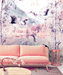Изображение акварельного рисунка цаплей на фоне пейзажа гор и озера в Японии украсит и дополнит интерьер вашей гостиной.