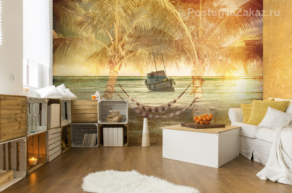 Изображение морского берега в тропиках с пальмами и пришвартованной лодкой в лучах закатного солнца украсит и дополнит интерьер вашей гостиной.