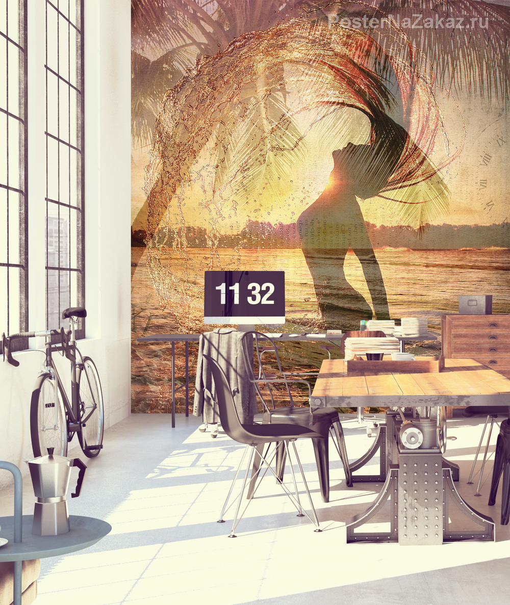 Изображение тропического рая с пальмой и девушкой в лучах закатного солнца украсит и дополнит интерьер вашей комнаты.