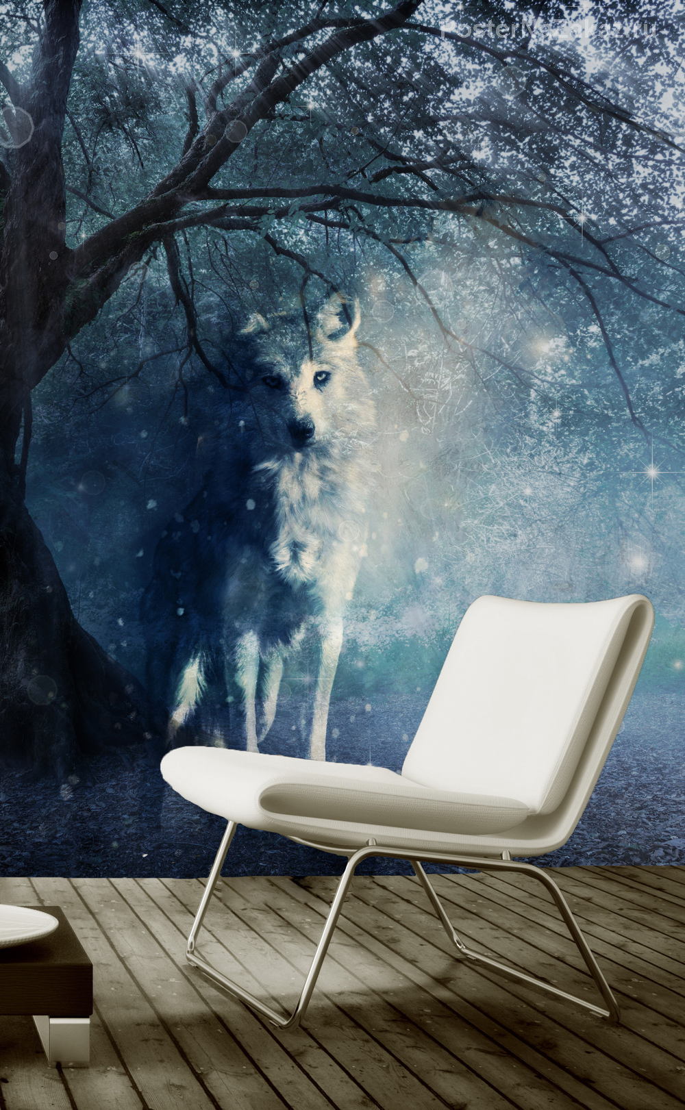 Фотообои с изображением волка, вышедшего из ночного туманного леса, придадут интерьеру комнаты таинственности.