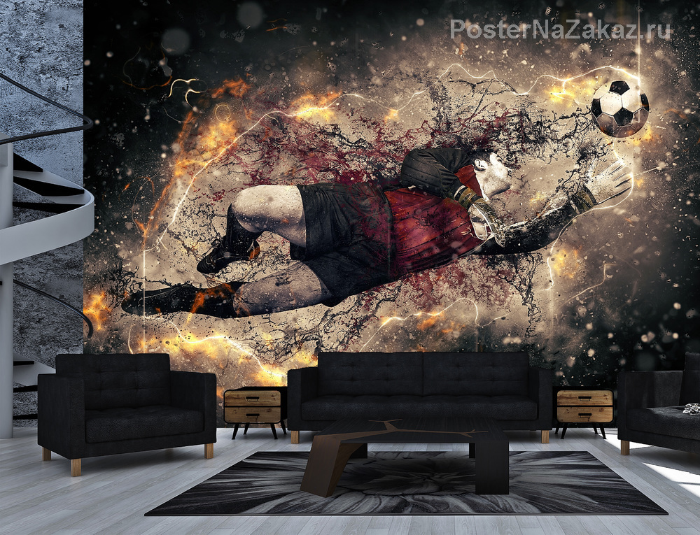 Стилизованные обои, вратарь ловит мяч, такая работа станет хорошим дополнением современного интерьера, подойдёт для гостиной, комнаты отдыха или спорт зала.