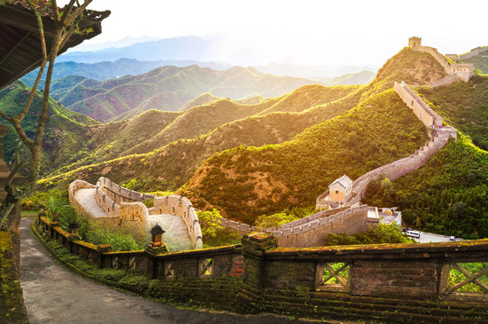 Фотообои с изображением тропинки с пейзажем Великой Китайской стены на рассвете с множеством растений и деревьев украсят и дополнят интерьер. Прекрасно подойдет для спальни и гостиной.