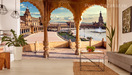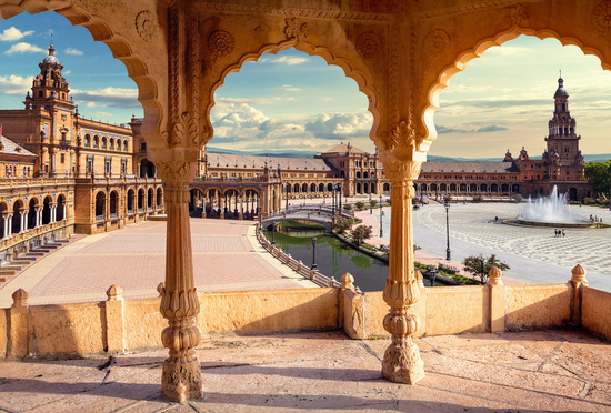 Фотообои с изображением старинных арок с видом на прекрасную испанскую площадь в Севилье на закате украсят и дополнят интерьер. Прекрасно подойдет для спальни и гостиной.