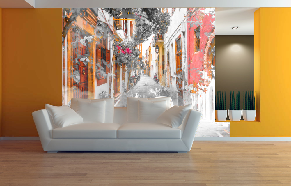 Флизелиновые фотообои с ПВХ-покрытием (виниловые фотообои на флизелиновой основе). Фактура  фреска.Материал пожаробезопасен и может использоваться в помещениях с повышенными требованиями пожарной безопасности. Плотность фотообоев изготовленных из данного материала составляет : 300 гр/м²