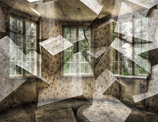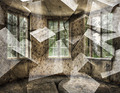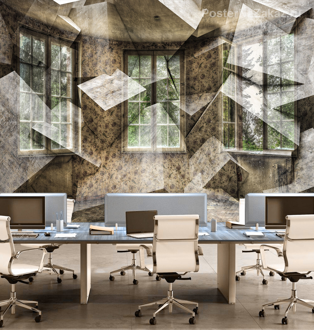 Обветшалая гостинная на геометрическом фоне, создаёт иллюзию присутствия, искажает пространство. Такие фото обои подойдут для гостиной, спальни или комнаты отдыха.Станут хорошим дополнением современного интерьера.