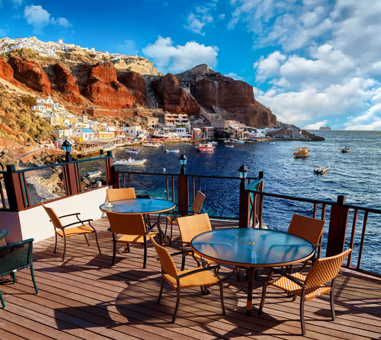 Фотообои с изображением террасы кафе с видом на красочный морской пейзаж порта в Европе украсят и дополнят интерьер. Прекрасно подойдет для спальни и гостиной.