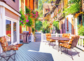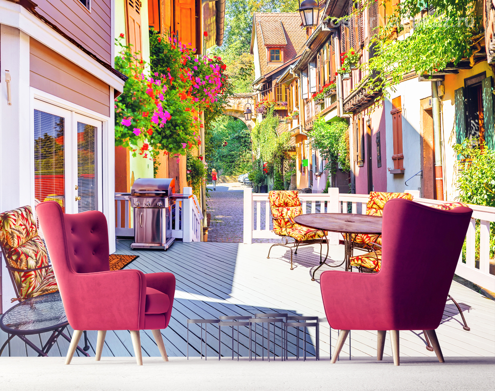 Фотообои с изображением прекрасного вида с терассы дома на улочку, отличное и интересное дополнение к оформлению вашей комнаты и интерьера
