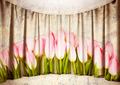 Фотообои с изображением букета нежных весенних тюльпанов с эффектом штор украсят и дополнят интерьер. Прекрасно подойдет для спальни и гостиной.