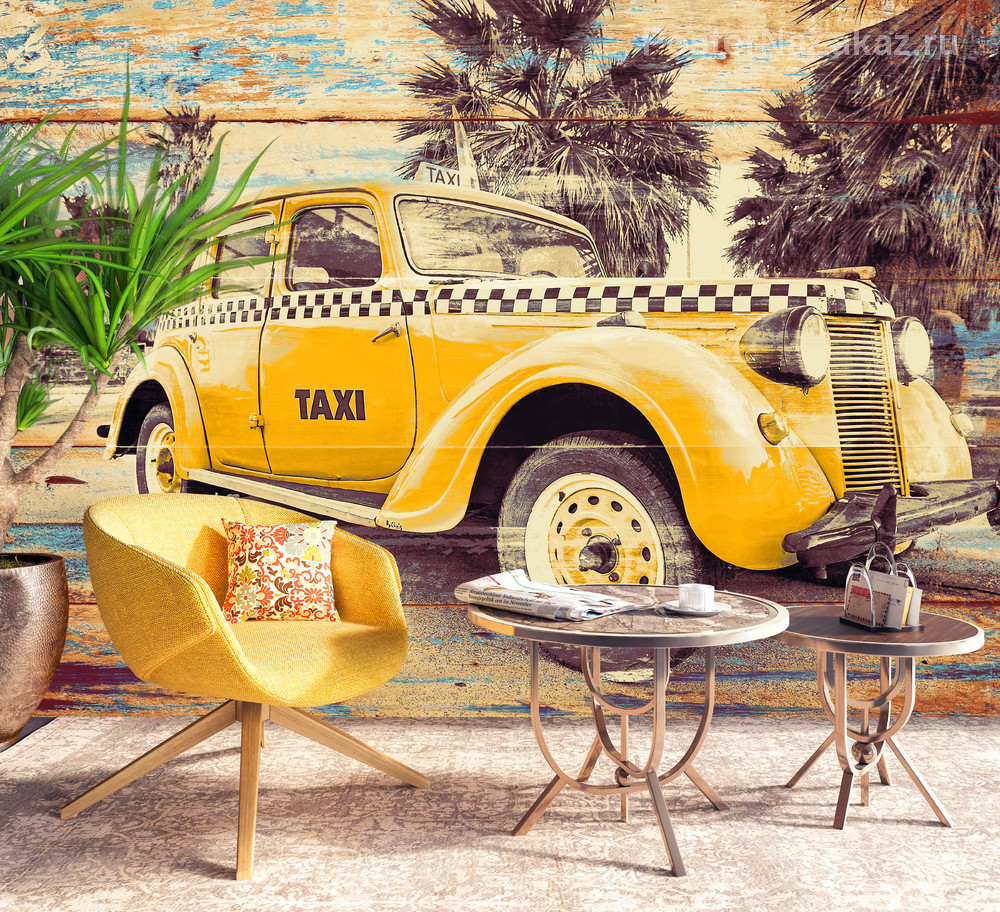 Фотообои с изображением ретро такси на фоне пальм в стиле лофт украсят и дополнят интерьер. Прекрасно подойдет для спальни и гостиной.