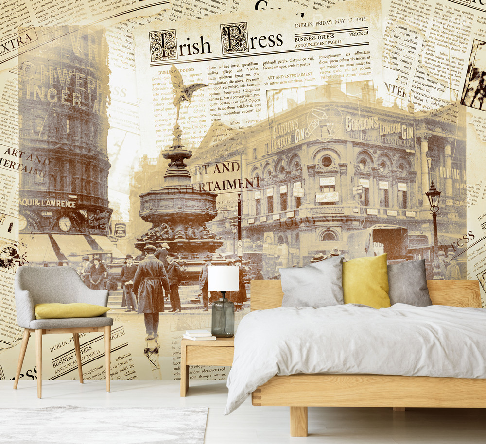 Фотообои с изображением Площади Пикадилли в Лондоне 1925 года на фоне старинных газет в ретро стиле украсят и дополнят интерьер. Прекрасно подойдет для спальни и гостиной.