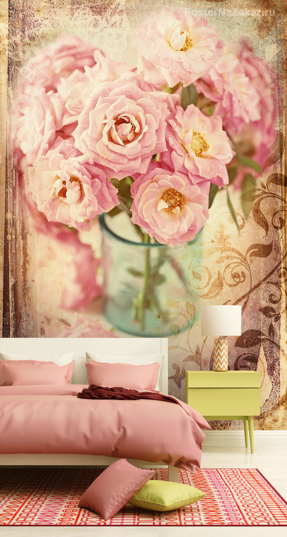 Фотообои с изображением букета нежных роз в вазе украсят и дополнят интерьер. Прекрасно подойдет для спальни и гостиной.
