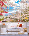 Фотообои с изображением неповторимого пейзажа за окном - цветущего сада в Японии, украсят и дополнят интерьер. Прекрасно подойдет для спальни и гостиной.