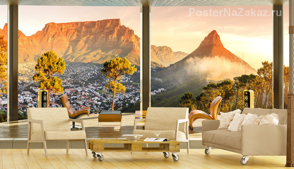 Фотообои с изображением неповторимого пейзажа за окном - портового города Кейптаун в Южной Африке, украсят и дополнят интерьер. Прекрасно подойдет для спальни и гостиной.