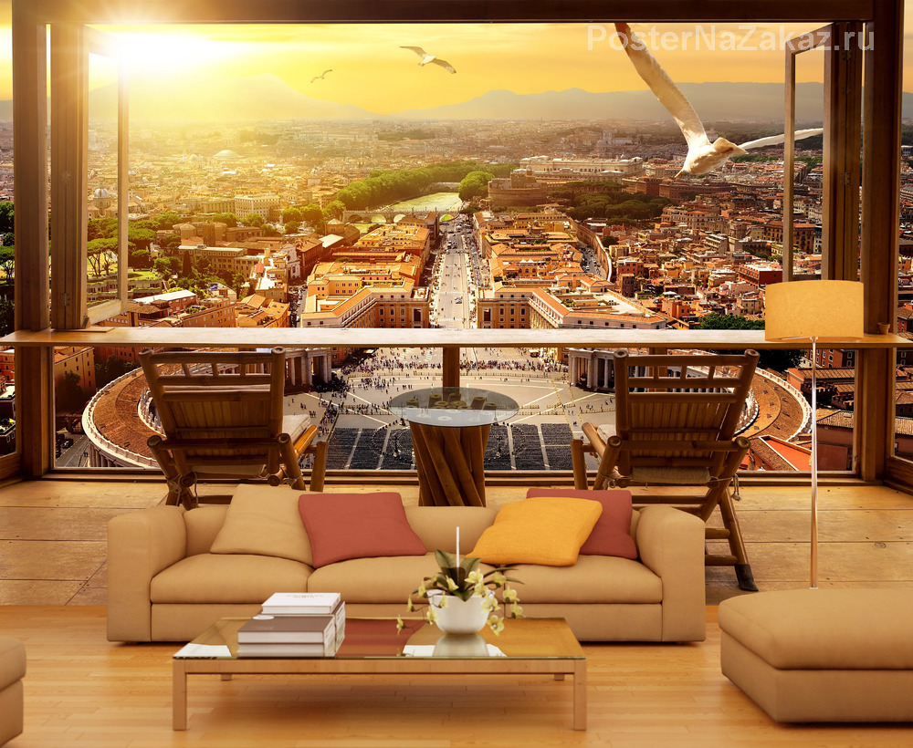 Фотообои с изображением неповторимого пейзажа за окном - панорама Ватикана в лучах рассвета, украсят и дополнят интерьер. Прекрасно подойдет для спальни и гостиной.