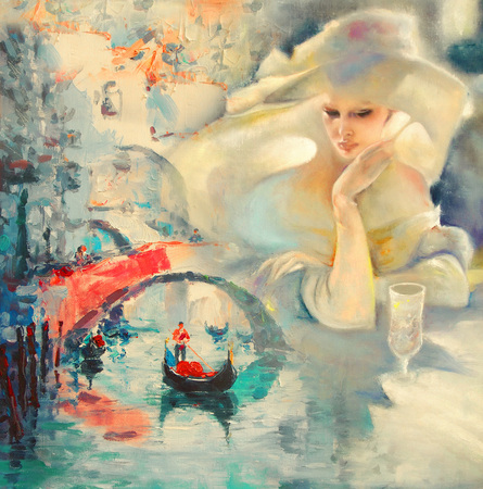 Фотообои с изображением старинной архитектуры Венеции на фоне прекрасной дамы, выполненные в стиле живописи маслом украсят и дополнят интерьер. Прекрасно подойдет для спальни и гостиной.