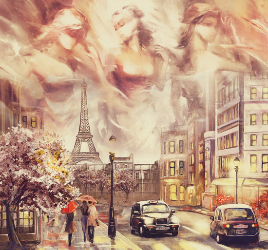 Фотообои с изображением архитектурного пейзажа Парижа на фоне прекрасных девушек, выполненные в стиле живописи маслом украсят и дополнят интерьер. Прекрасно подойдет для спальни и гостиной.