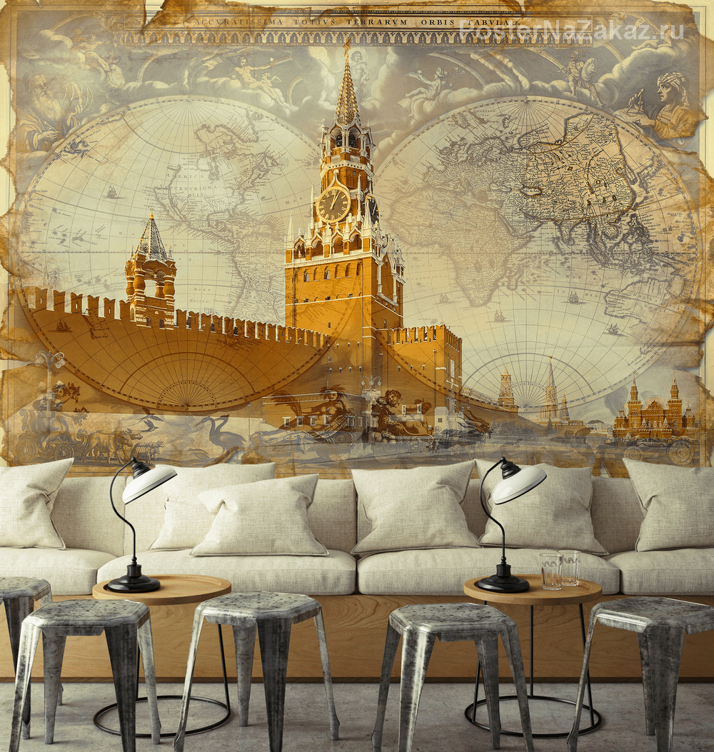 Фотообои с изображением Красной площади в Москве на фоне карты мира, выполненные в монохромном стиле украсят и дополнят интерьер. Прекрасно подойдет для спальни и гостиной.