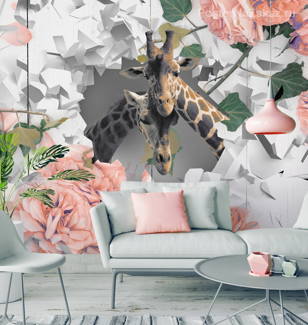 Фотообои с изображением влюбленной парочки жирафов, в окружении цветущих роз, с 3D эффектом украсят и дополнят интерьер. Прекрасно подойдет для спальни и гостиной.