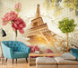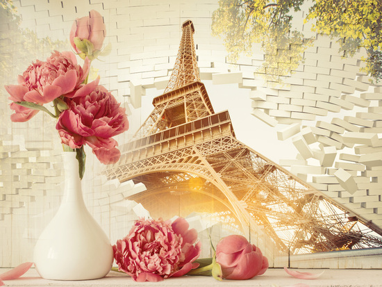 Фотообои с изображением Эйфелевой башни в Париже, разрушающей стену, с 3D эффектом на фоне букета пионов украсят и дополнят интерьер. Прекрасно подойдет для спальни и гостиной.