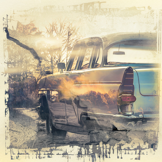 Фотообои с изображением ретро автомобиля на фоне деревьев густого леса в лучах рассвета в стиле лофт украсят и дополнят интерьер. Прекрасно подойдет для спальни и гостиной.