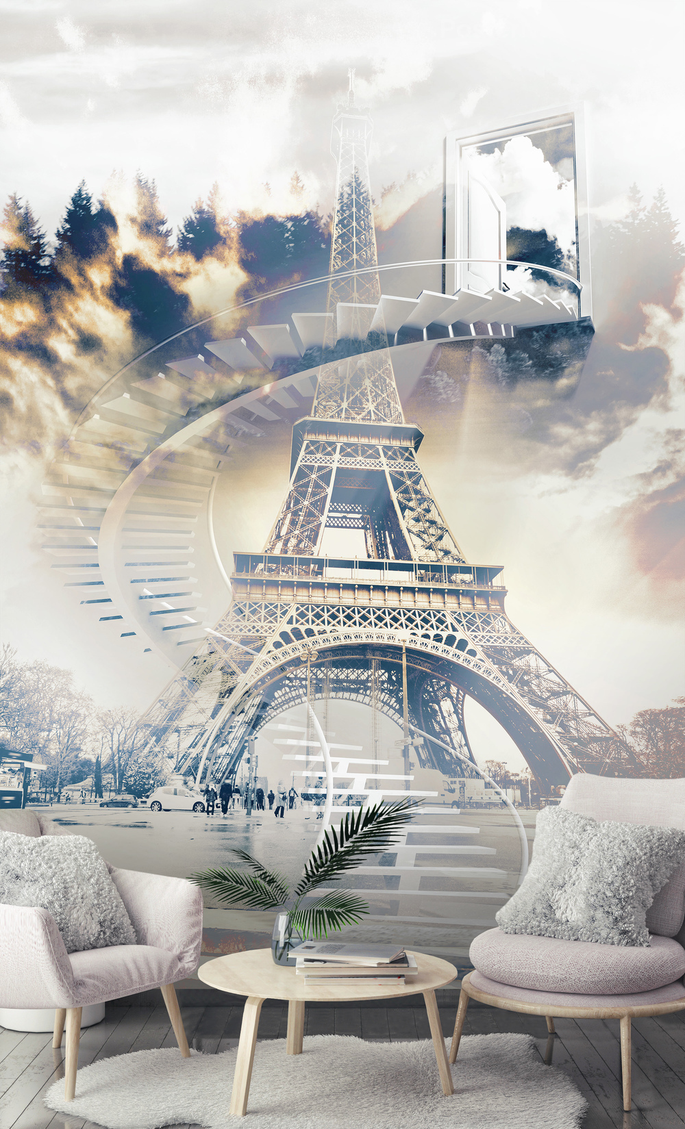 Фотообои с изображением знаменитой Эйфелевой башни в сочетании с винтовой лестницей, ведущей в другое измерение с 3D эффектом на фоне городского пейзажа украсят и дополнят интерьер. Прекрасно подойдет для спальни и гостиной.