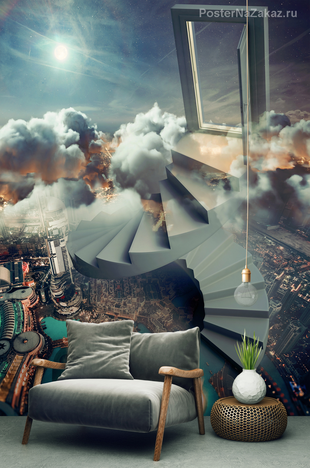 Фотообои с изображением ночного мегаполиса в сочетании с лестницей, ведущей в другое измерение с 3D эффектом в окружении пышных облаков и лунного света украсят и дополнят интерьер. Прекрасно подойдет для спальни и гостиной.