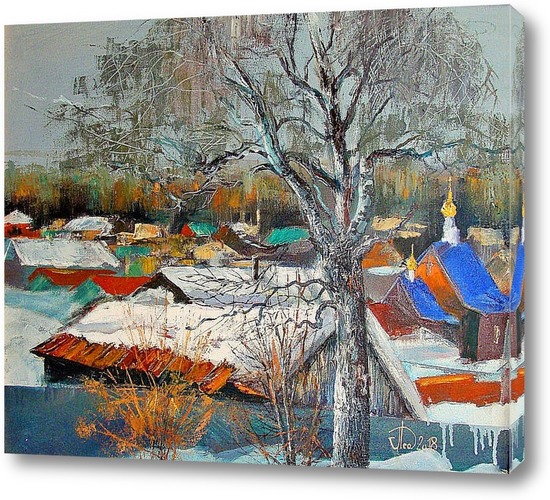 Описание картины село, береза, дома, день, небо, деревья, лес, быт, россия, деревня, сельский пейзаж, русский пейзаж, импрессионизм, Тюмень, москва, картина, зимний пейзаж, снег, зима, село, лес, зима
