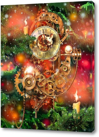 Описание картины Новогодняя открытка, крыса появляется прямо из часов, из механизма, её тень падает на циферблат, на дальнейшее время года, теперь она правит