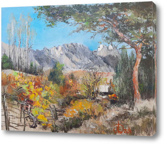 Описание картины осень горный пейзаж тропинка ель сосна лес скала купить картину картина маслом картина для интерьера картина крымский пейзаж остров море ай-петри гора лето крым