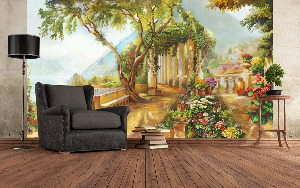 Флизелиновые фотообои с ПВХ-покрытием (виниловые фотообои на флизелиновой основе). Фактура  фреска.Материал пожаробезопасен и может использоваться в помещениях с повышенными требованиями пожарной безопасности. Плотность фотообоев изготовленных из данного материала составляет : 300 гр/м²