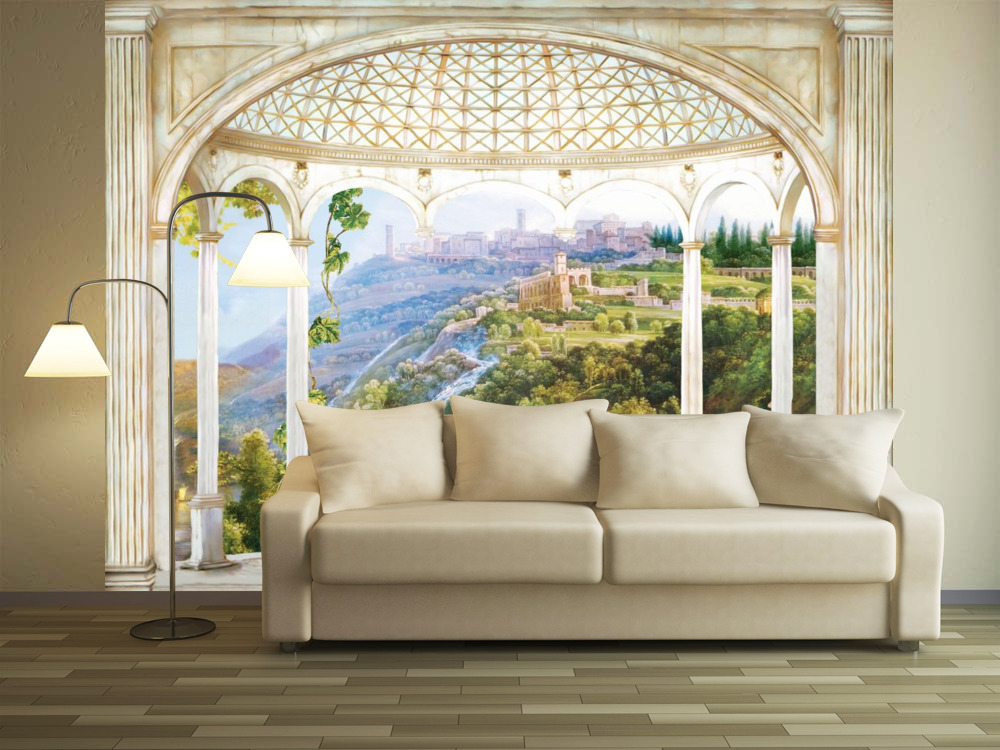 Флизелиновые фотообои с ПВХ-покрытием (виниловые фотообои на флизелиновой основе). Фактура  фреска.Материал пожаробезопасен и может использоваться в помещениях с повышенными требованиями пожарной безопасности. Плотность фотообоев изготовленных из данного материала составляет : 300 гр/м²