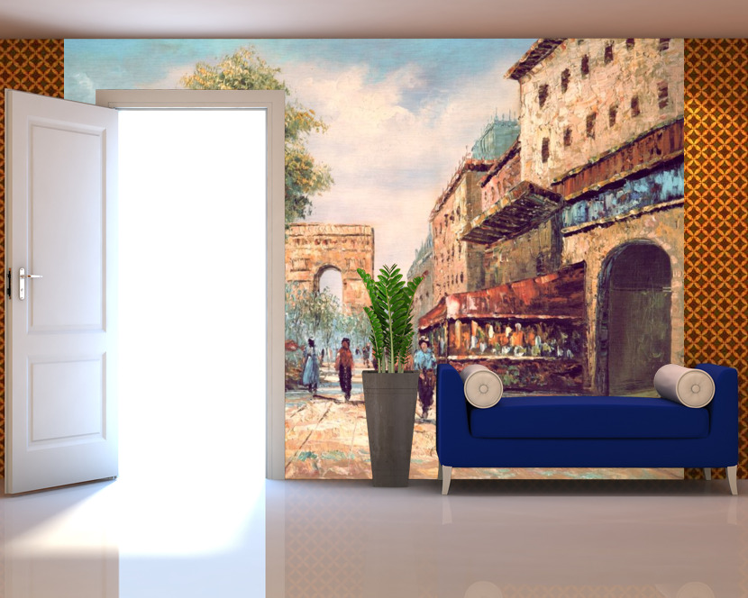 Флизелиновые фотообои с ПВХ-покрытием (виниловые фотообои на флизелиновой основе). Фактура  фреска.Материал пожаробезопасен и может использоваться в помещениях с повышенными требованиями пожарной безопасности. Плотность фотообоев изготовленных из данного материала составляет : 300 гр/м²