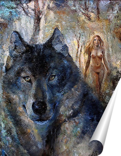Описание плаката Обнаженная девушка в образе ведьмы идет по лесу со своей подругой волчицей