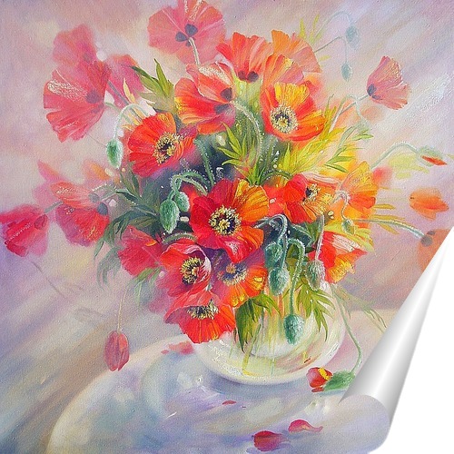 Описание плаката Маки на солнце в стеклянной вазе на круглом столе