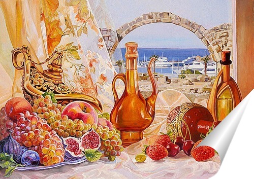 Описание плаката Оригинальный фруктовый натюрморт в сочных и праздничных тонах. Здоровая пища, сладчайшие фрукты и пряные масла в изысканных сосудах. Может стать достойным украшением гостиной или кухни любителя изысков Востока.