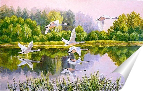 Описание плаката Сюжет картины создан для любителя Российской природы с ее пушистыми лесами, зеркальными озерами, наполнеными свежестью вод и почти неслышным шорохом взмаха крыльев взлетающих белых лебедей. Картина чудесно будет смотреться к примеру на даче или загор