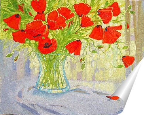 Описание плаката У окна , на столе стоит ваза с букетом маков. Солнечный свет пронизывает воздух, играет на цветах и наполняет картину радостным, весенним настроением.