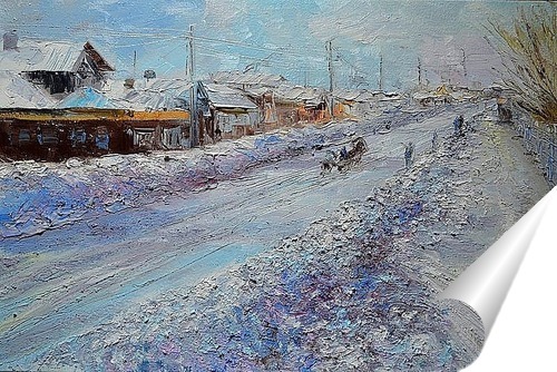 Описание плаката Зимняя дорога, была написана в 2012 году. Заснеженная деревня, с повозкой и маленькими домиками. Техника исполнения мастихин. Художник Лебедева-Полищук Людмила...