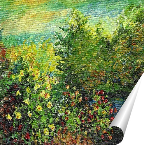 Описание плаката авторская копия морского пейзажа французского импрессиониста Клода Моне, великолепная передача света и тени,мастерское владение колористической палитрой в изображении цветущего сада и отражением в воде пруда.