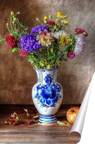 Описание плаката Натюрморт с букетом цветов в вазе Гжель. Осенние листья, осеннее настроение. Яблоко. Деревянная столешница. На сером фоне. Хризантемы. Астры. Полевые цветы.