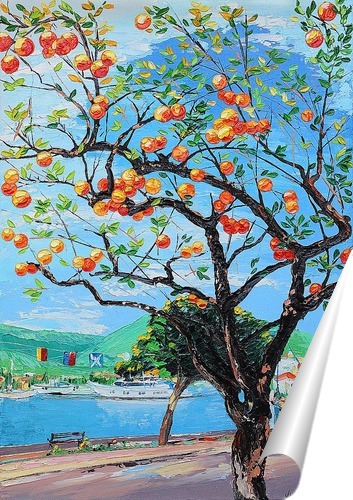 Описание плаката Картина "Апельсиновый полдень", масло, холст, 50х35см, 2013. Автор: Разнатовская Виктория. Апельсиновое дерево растущее на греческом острове. Яркая, красочная картина украсит любой интерьер.