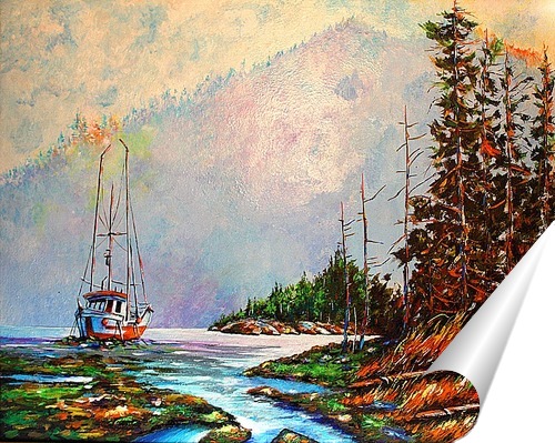 Описание плаката Картина написана акрилом на одном из озер севера России, Сейнер стоит на берегу на мелкой а вместе с ней большой косяк северной семги, В все замерло в ожидании большого лова.
