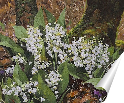 Описание плаката Весенний лес. Сквозь старую,бурую листву пробиваются ландыши, одни из самых нежных и романтичных цветов. Деревья поросли мхом.Сырой, весенний воздух смягчает цвета