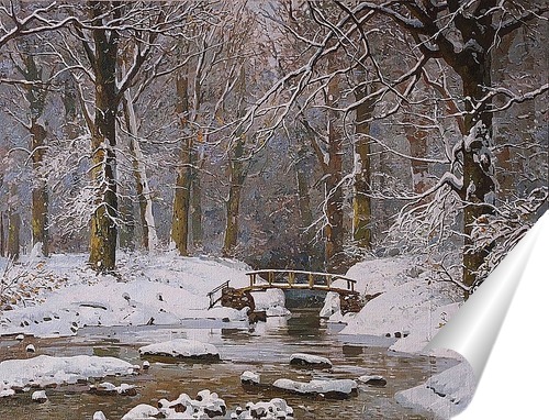Описание плаката Зимний лес - лучшее место для прогулок.Снег смягчает очертания, насыщает мотив рефлексами. Ручей около берегов схвачен тонким льдом, а вода в нем прозрачна и чиста. На кустарниках редкие золотистые листочки.