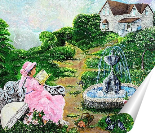 Описание плаката В прекрасном живописном месте за городом юная леди проводит время за чтением интересной книги. Тихо бурлит вода в фонтане, щебечут птицы , и нет суеты.