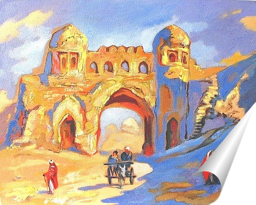 Описание плаката Картина маслом--Древний восточный город, как в сказке хранящий за своими воротами необычайные тайны и дворцовые сокровища, сказки Аладдина и Шахерезады...