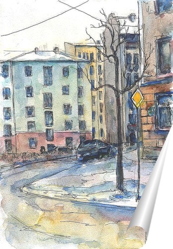 Описание плаката повернув на улице увидел восхитительный образ этого старого и романтического района города. солнце, еще не стаявший снег, машина на обочине и цветные дома-колодцы