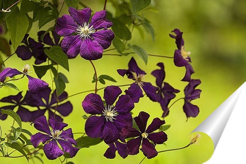 Описание плаката Клематис— род растений семейства Лютиковые. Клематисы, как правило, представляют собой многолетние травянистые или деревянистые растения, произрастающие в субтропической и умеренной климатических зонах. Широко используются в декоративном садоводстве,